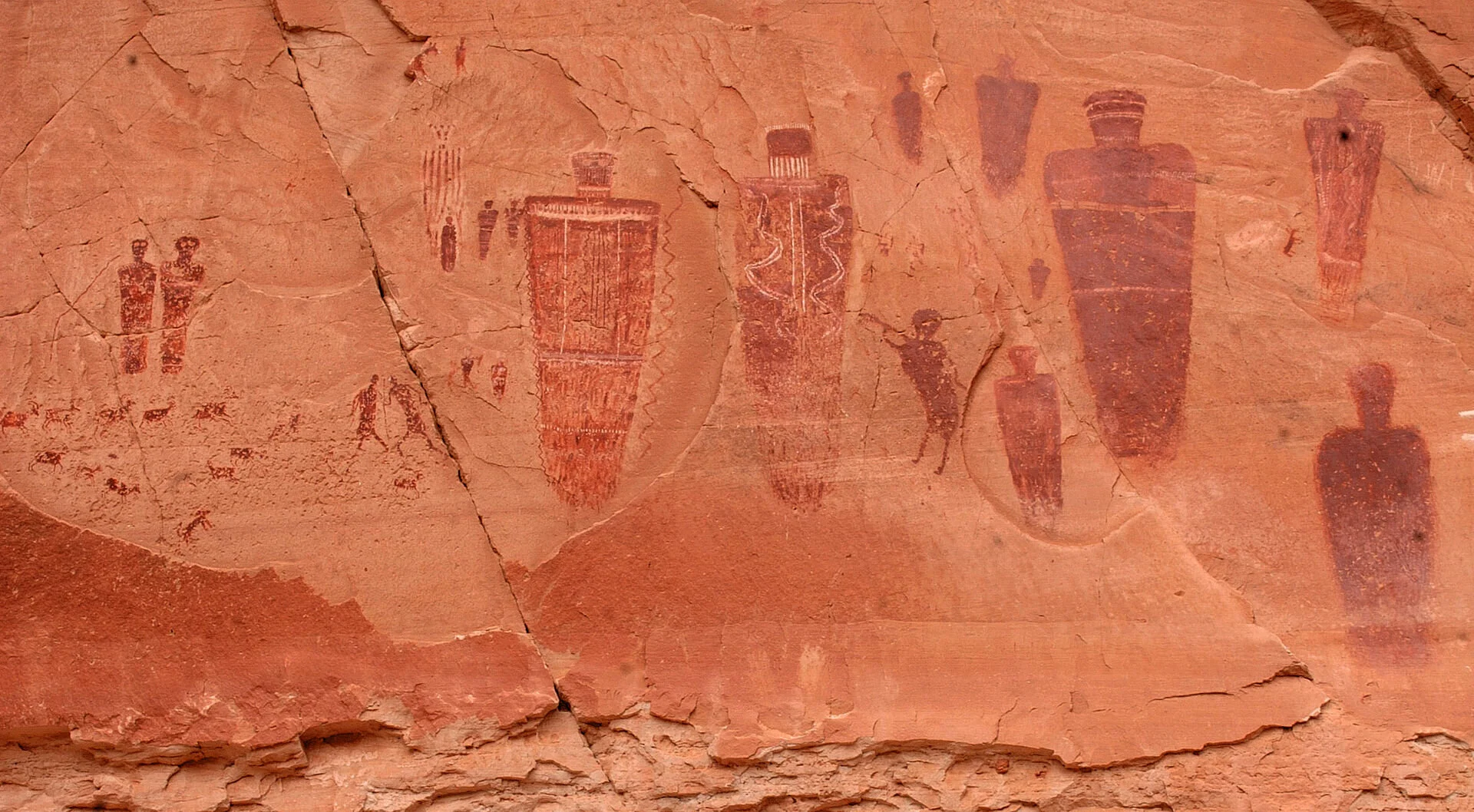 The Great Gallery is the best known and most spectacular panel of both Barrier Canyon style pictographs and petroglyphs in Horseshoe Canyon. At over 200 feet long, the extensive panel is extremely well-preserved containing life-size figures with intricate designs believed to be 1,500-4,000 years old.